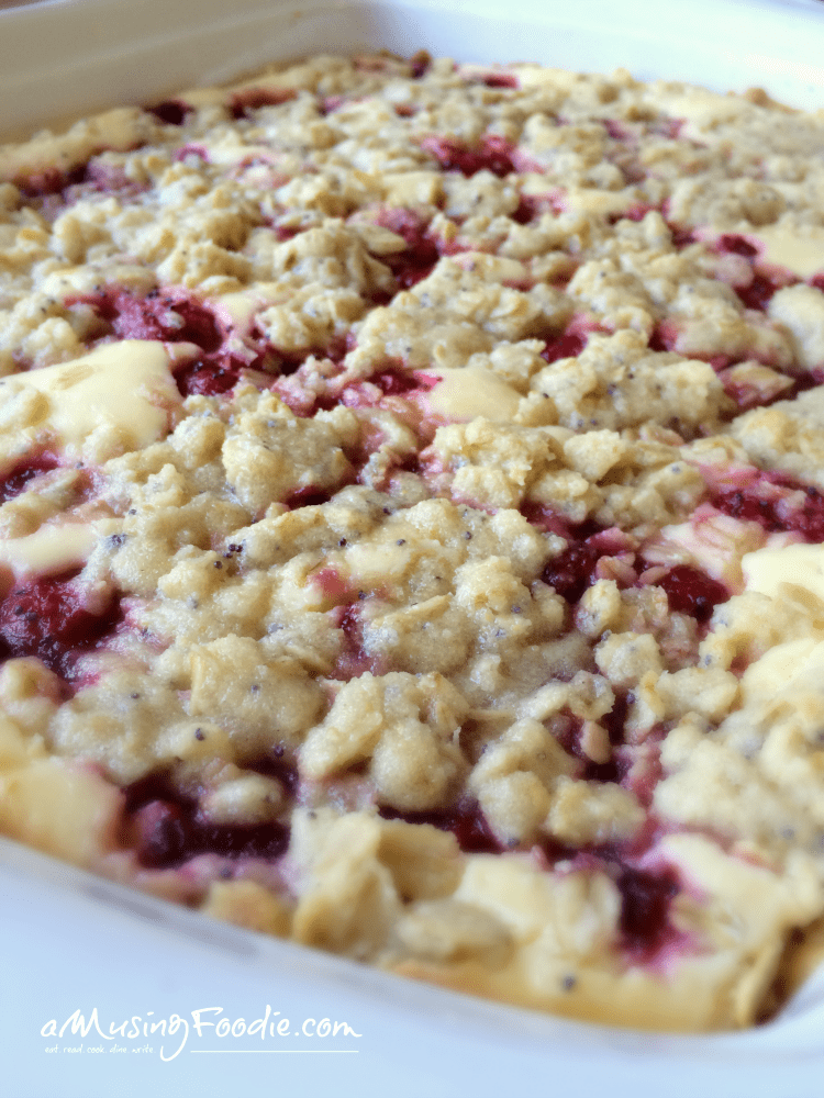 - Sprinkle the raspberry mixture evenly on top of the cheesecake filling, followed by the topping (recipe below). Sprinkle 1 tablespoon of poppy seeds on top.