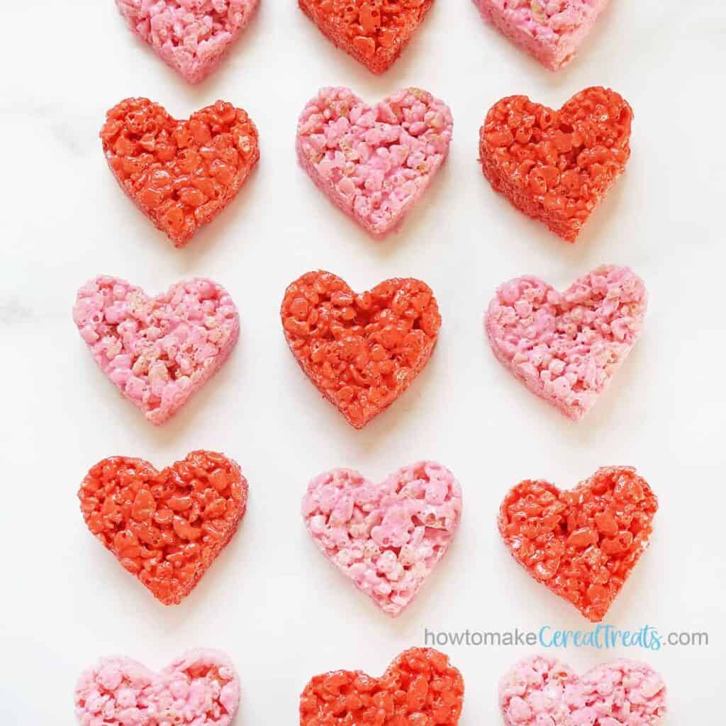Heart-shaped rice cereal treats with marshmallows and festive toppings.