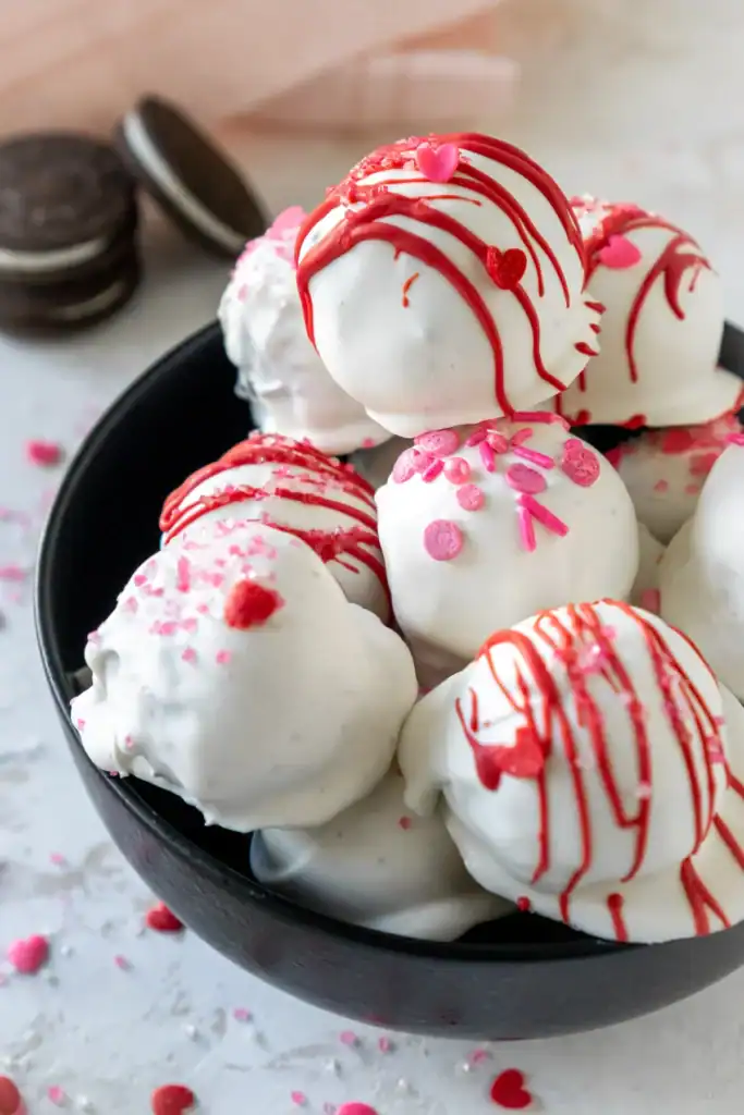 Smooth, creamy oreo truffles flavored for Valentine’s Day without baking.