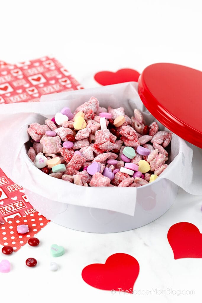 Sweet, chocolate-coated cereal mix (Muddy Buddies) with a festive twist.