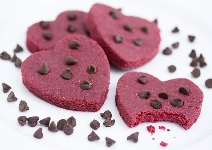 Heart-shaped skinny no-bake red velvet cookies with beet-sweet color, gluten-free, vegan goodness — a wholesome Valentine’s day treat.